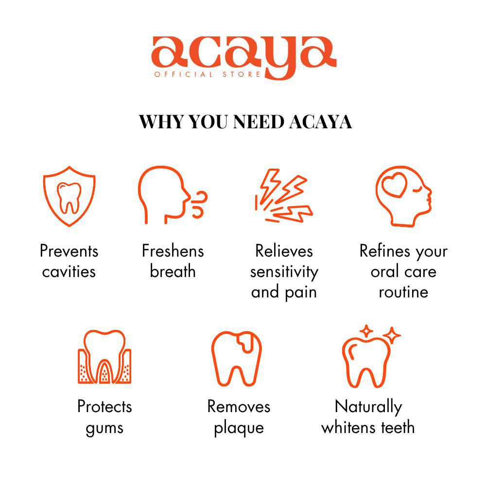 Premium toothpastes designed to bathe your teeth in great scent, delightful flavors, and cleansing ingredients – proven to prevent cavities and reduce sensitivity. Start moving through the day confidently with a tube of Acaya.