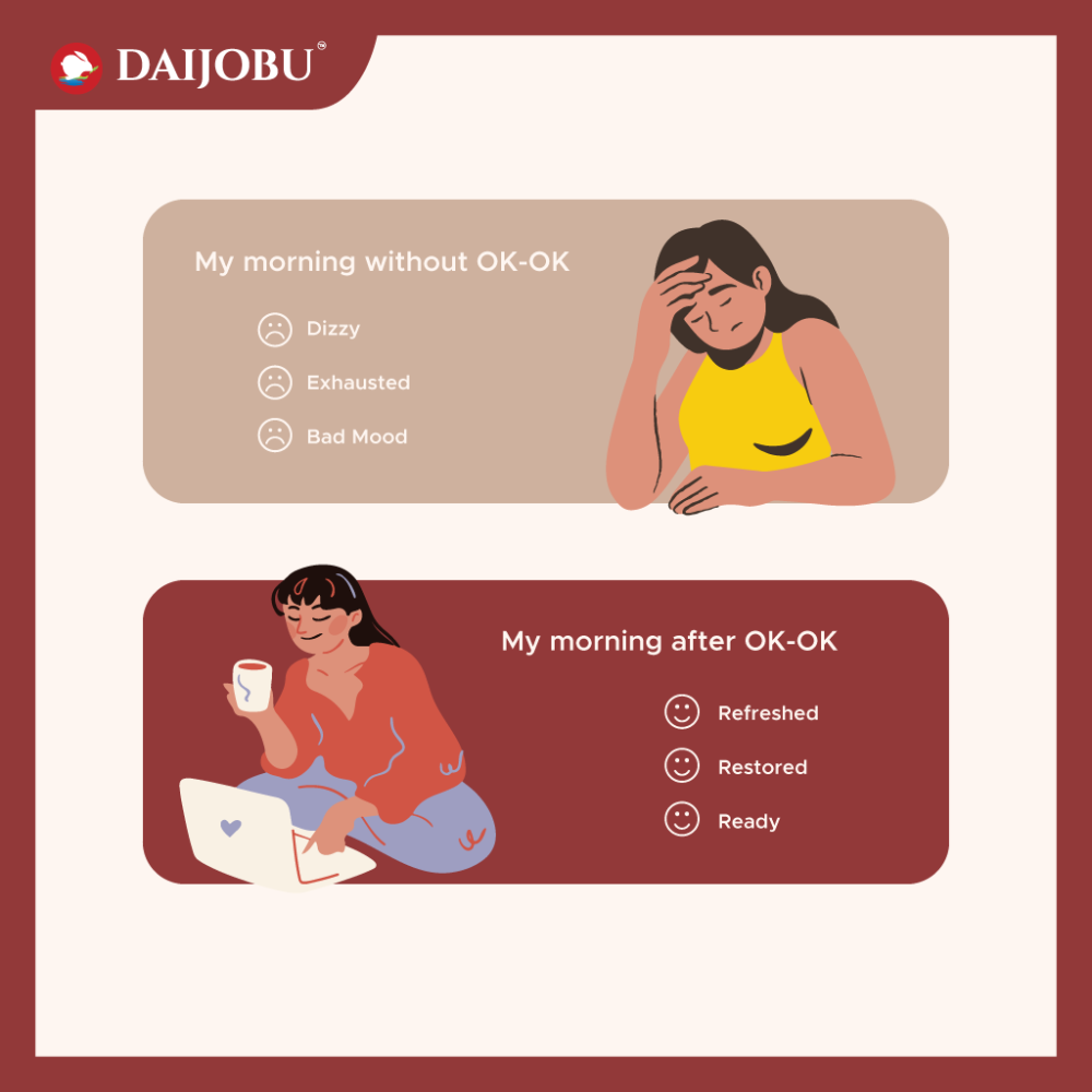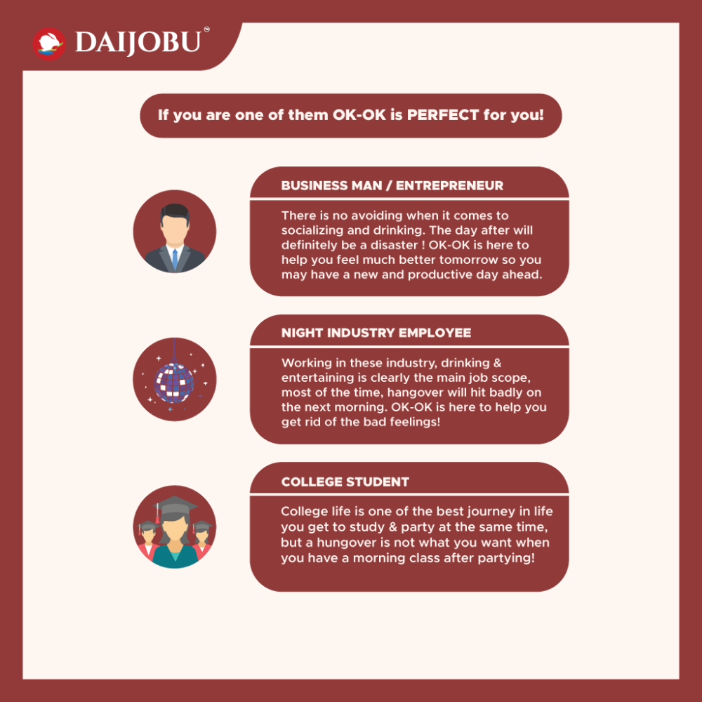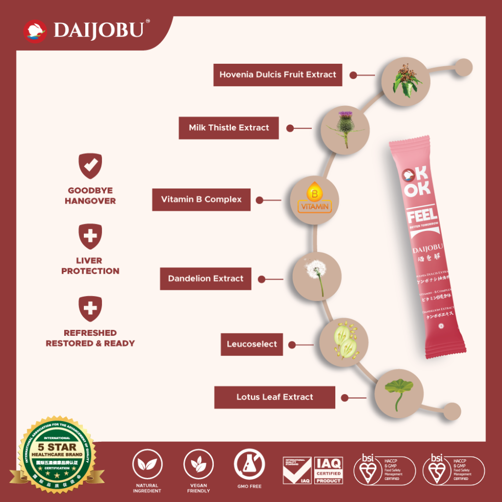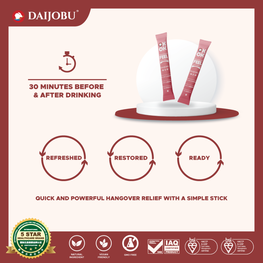 • Daijobu ok-ok is specially formulated to alleviate hangover symptoms effectively, allowing you to wake up feeling refreshed after a night of drinking.