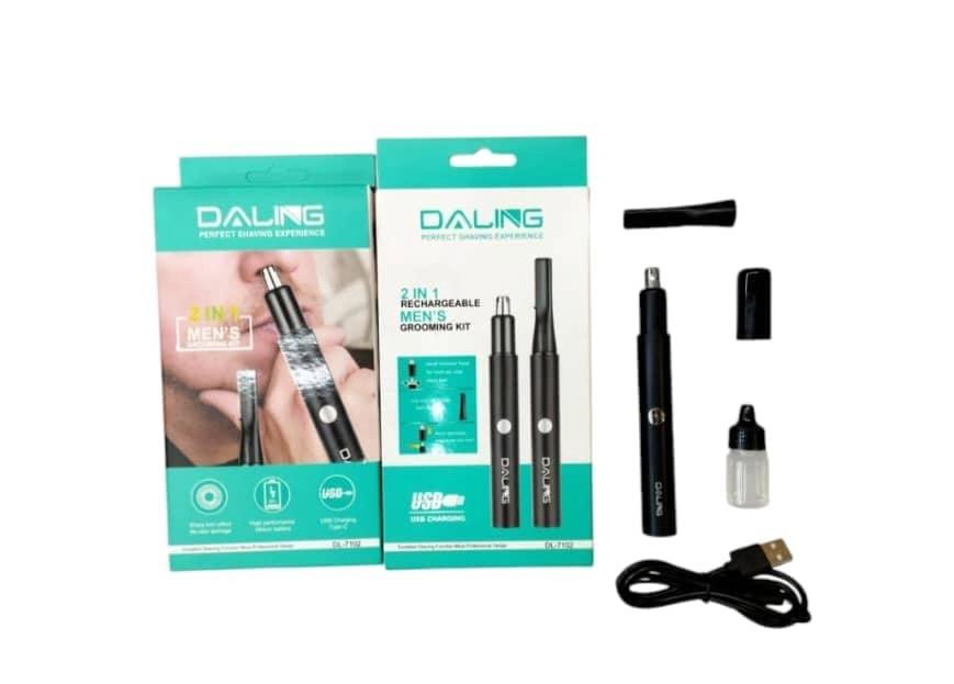 - The DALING DL-7102 2-in-1 Men’s Grooming Kit is designed to offer a perfect shaving experience with its blend of functionality and convenience. This grooming kit is an ideal solution for those seeking precision and ease-of-use in their grooming routine. It ensures a sharp trimming effect while being gentle on the skin, so users can maintain their desired look without any discomfort.
