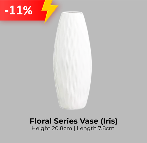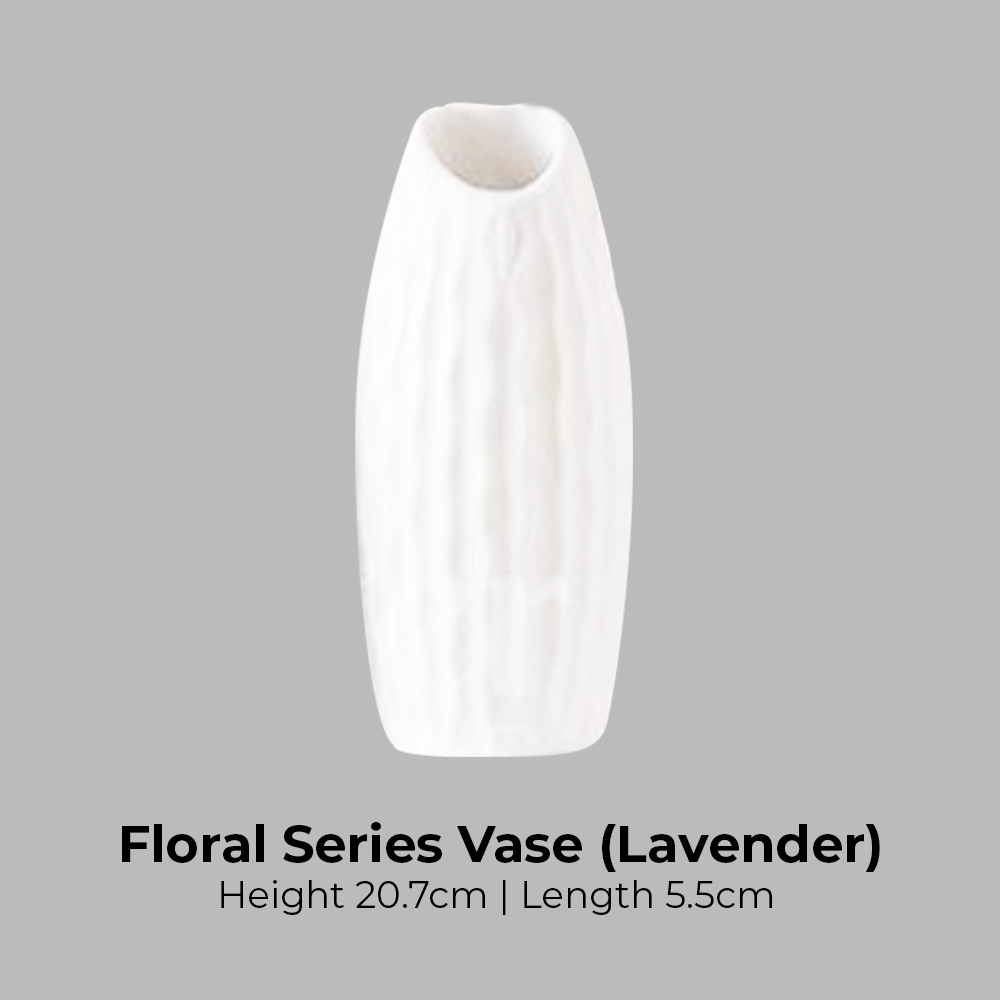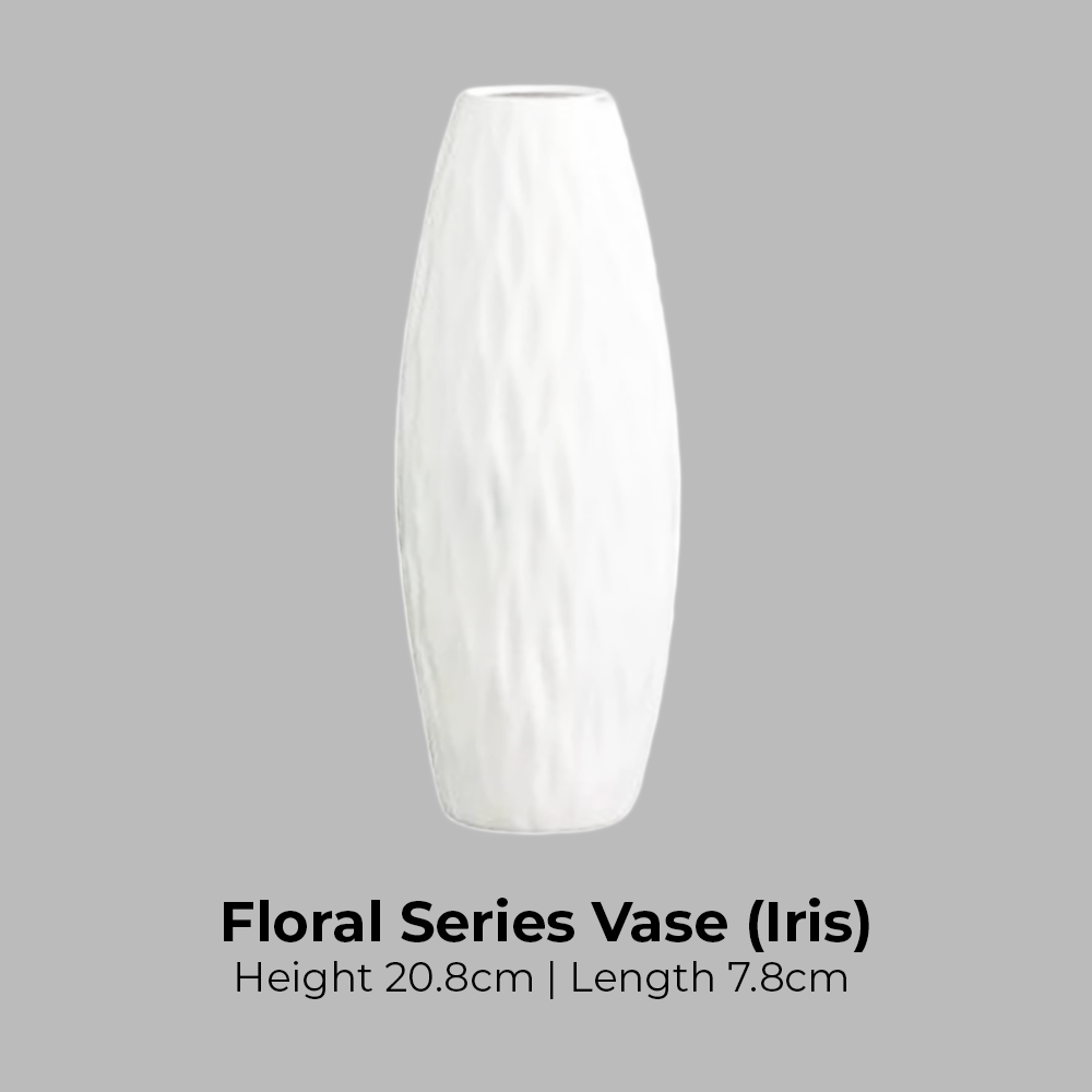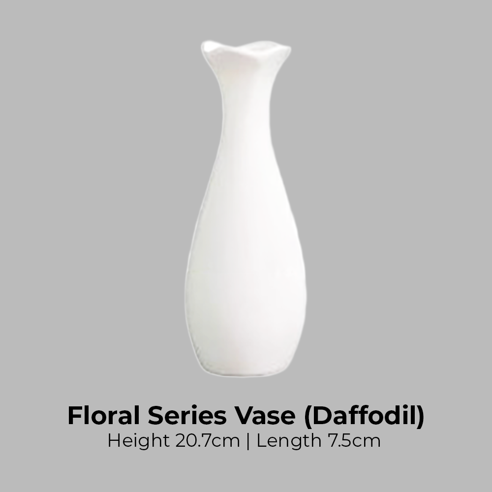 Introducing our Floral Series Ceramic Vase to compliment your home deco: 1. Every design is unique on its own 2. Suitable for indoor and outdoor 3. Dimensions: Zinnia- H21cm x L7cm Dahlia - Opening D3.7cm x H12.5cm x L6.5cm Rose - Opening D3.3cm x H11.8cm x L6.2cm Tulip - Opening D3.2cm x H12.5cm x L6cm Camellia - Opening D3.8cm x H12.5cm x L6cm Violet - Opening D3.7cm x H12.7cm x L5.8cm Orchid - Opening D3.8cm x H12.8cm x L6cm Magnolia - Opening D3cm x H12.5cm x L6cm Daffodil - H20.7cm x L7.5cm Lavender - H20.7cm x L5.5cm Iris - H20.8cm x L7.8cm Peony - H20.4cm x L7.3cm Hyacinth - Opening D3.9cm x H13cm x L6.3cm 4. Material: Ceramic 5. Package includes: Vase only 6. Disclaimer: Product might have uneven coating, scratches and discoloured spots
