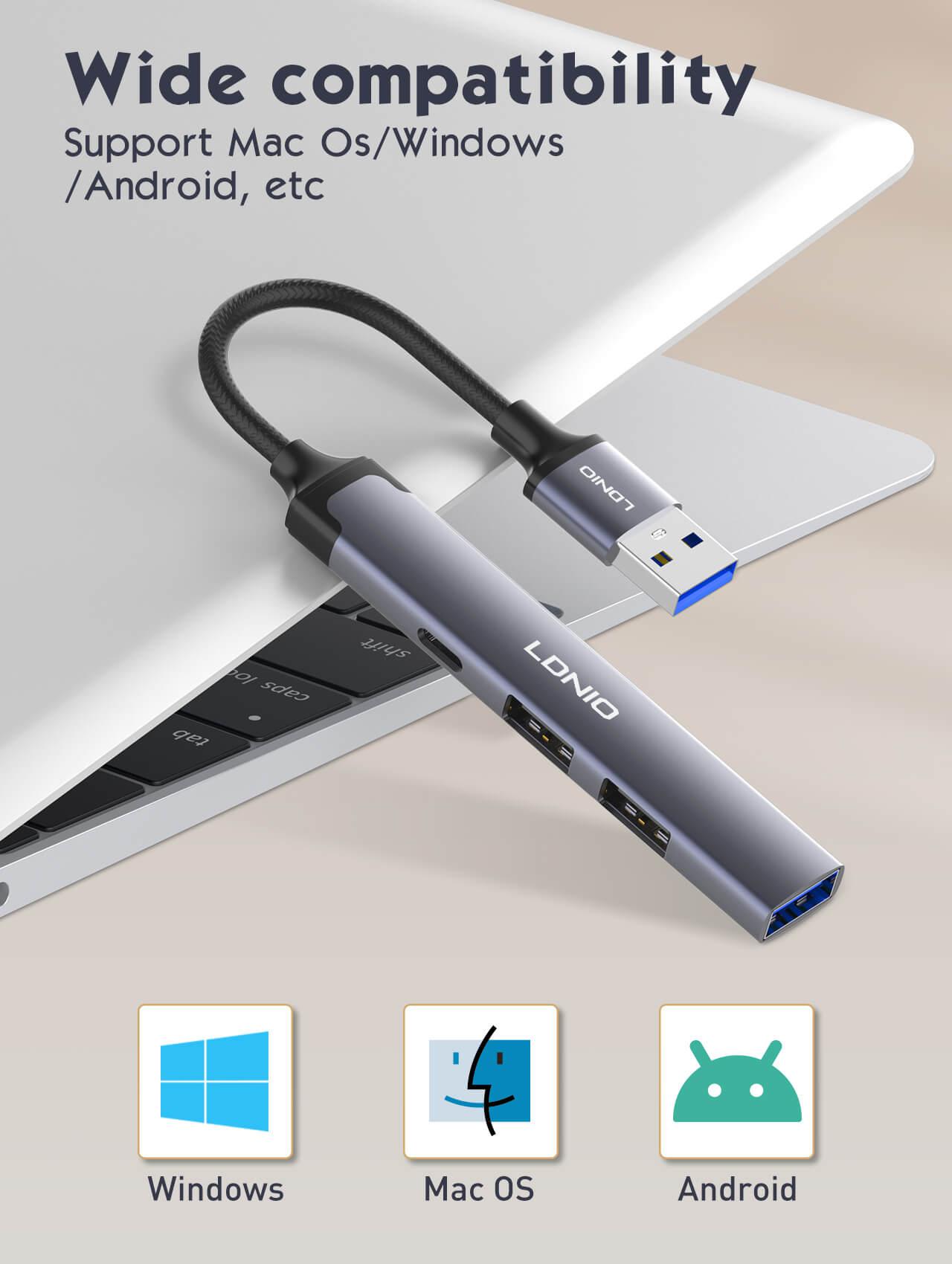 1. 4-in-1 multifunction hub with USB-C input, compatible with laptops, tablets, and MacBook