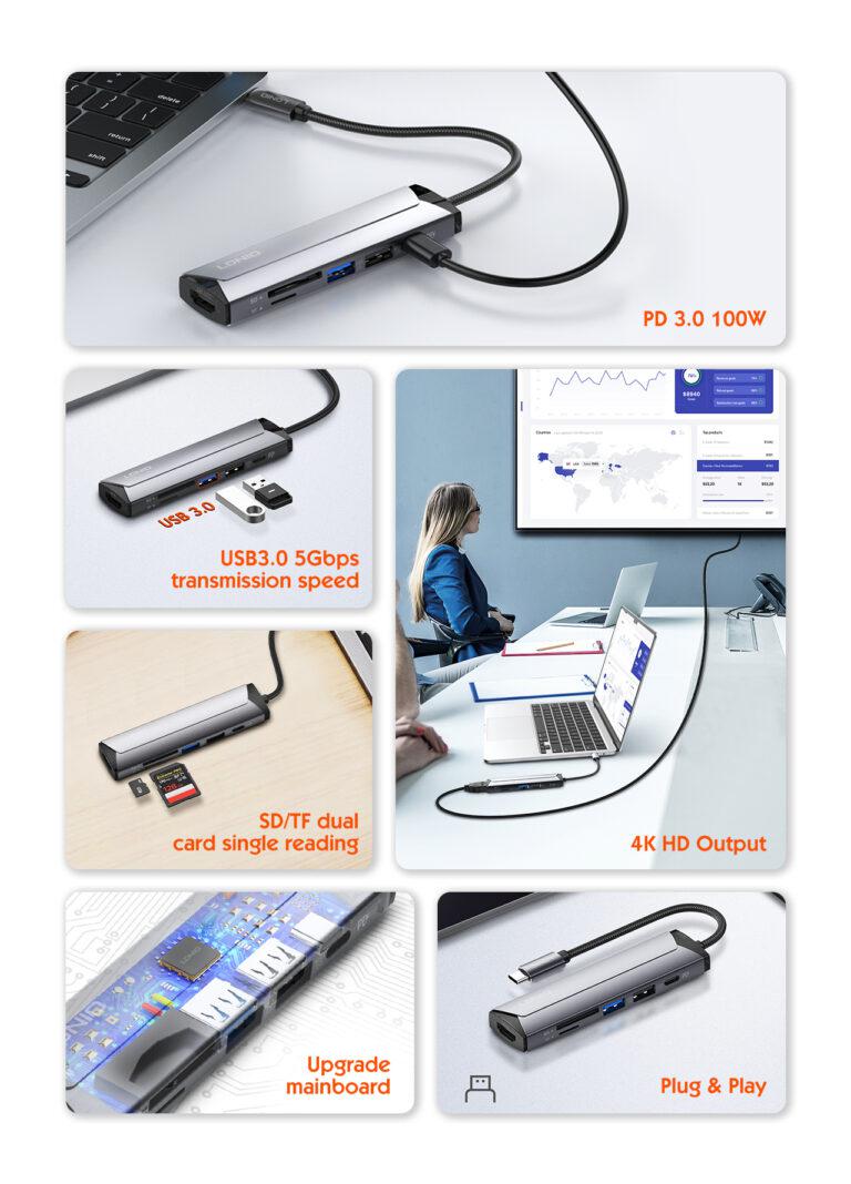 1. 6-in-1 multifunction hub with USB-C input, compatible with laptops, tablets, and MacBook