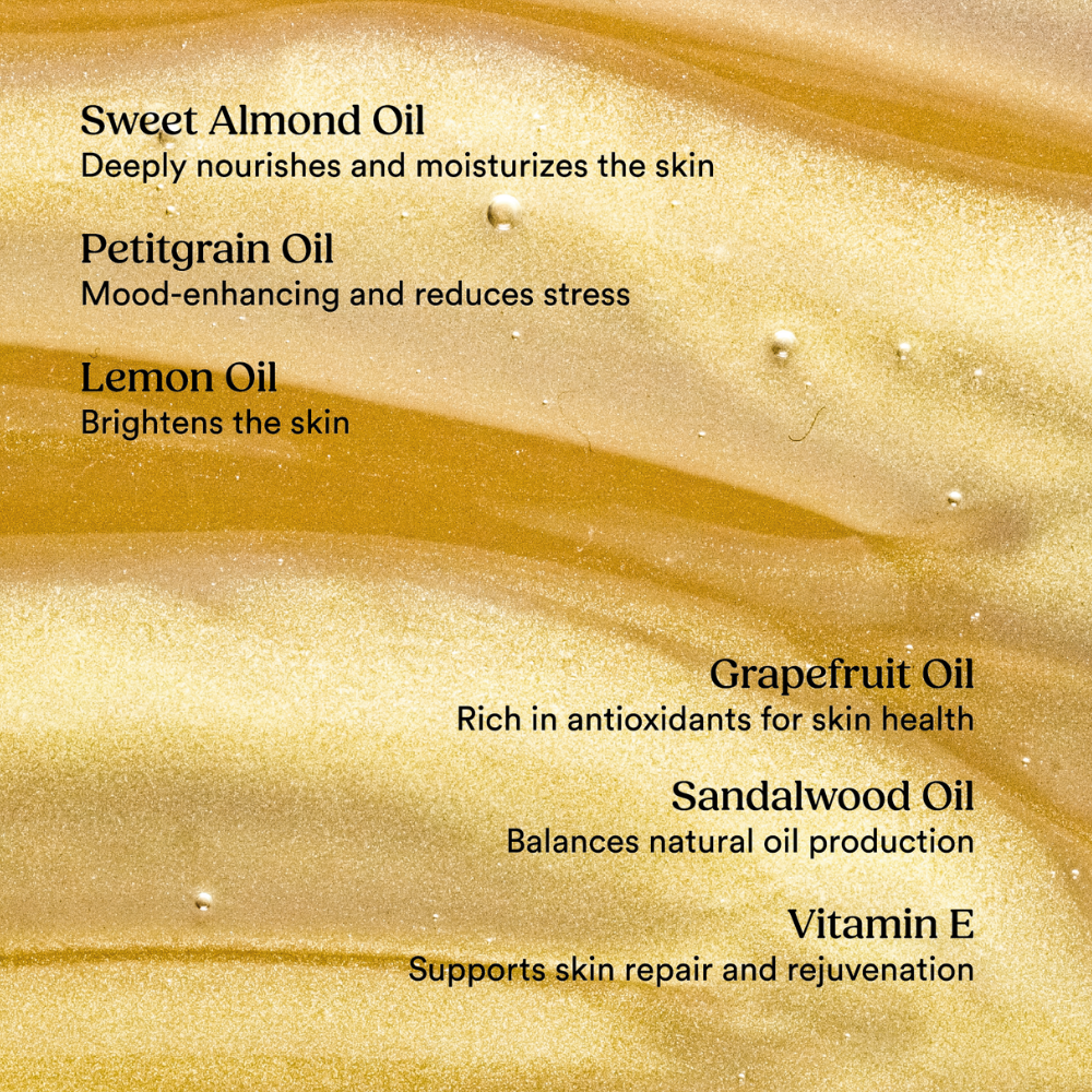 • Immerse yourself in the enchanting aromas of sweet almond oil, petitgrain oil, sandalwood oil, grapefruit oil, and lemon oil, which are combined with nourishing vitamin e to provide a luxurious sensory experience.