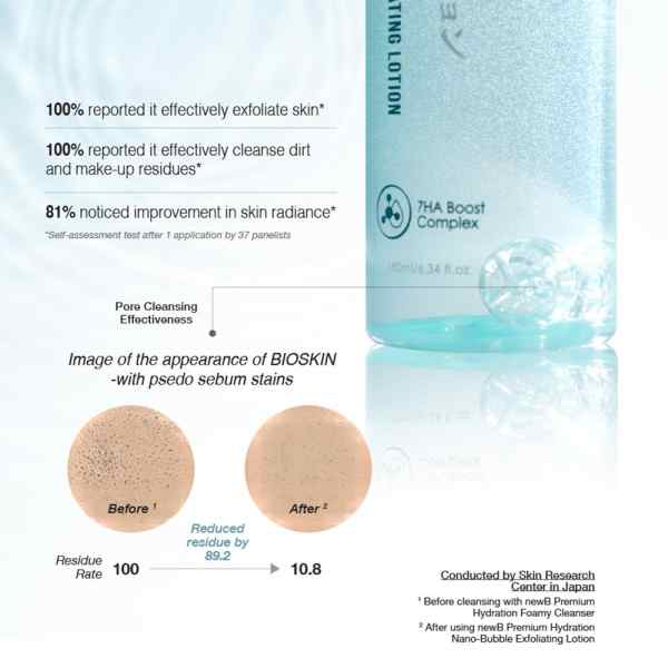 • Exfoliating lotion with japanese patented nano bubble technology that activates ultra-fine bubbles which can penetrate the epidermal layers for enhanced cleansing