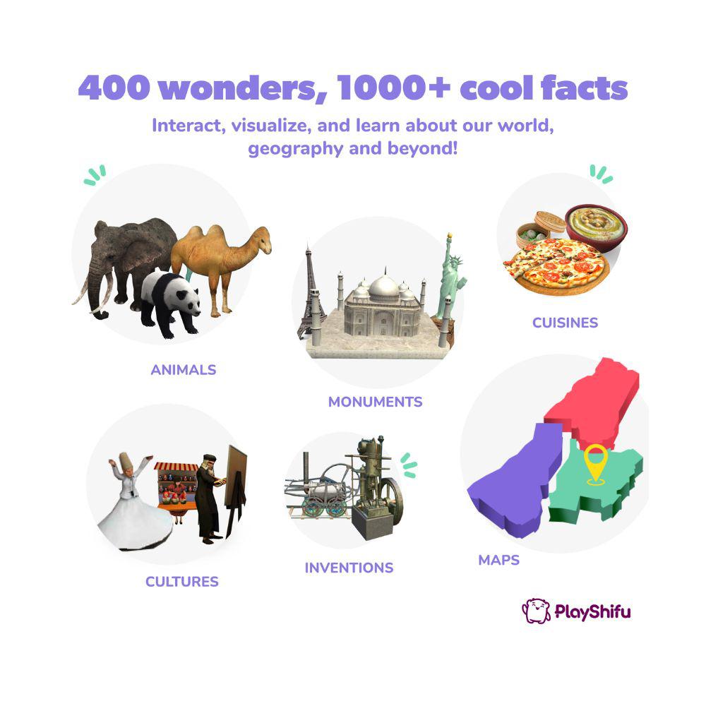 - Across 6 categories - cultures, cuisines, monuments, inventions, animals and maps.