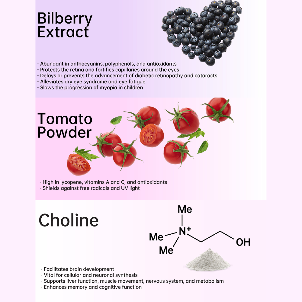 • Additional Ingredients: Bilberry, Tomato Powder, and Choline.