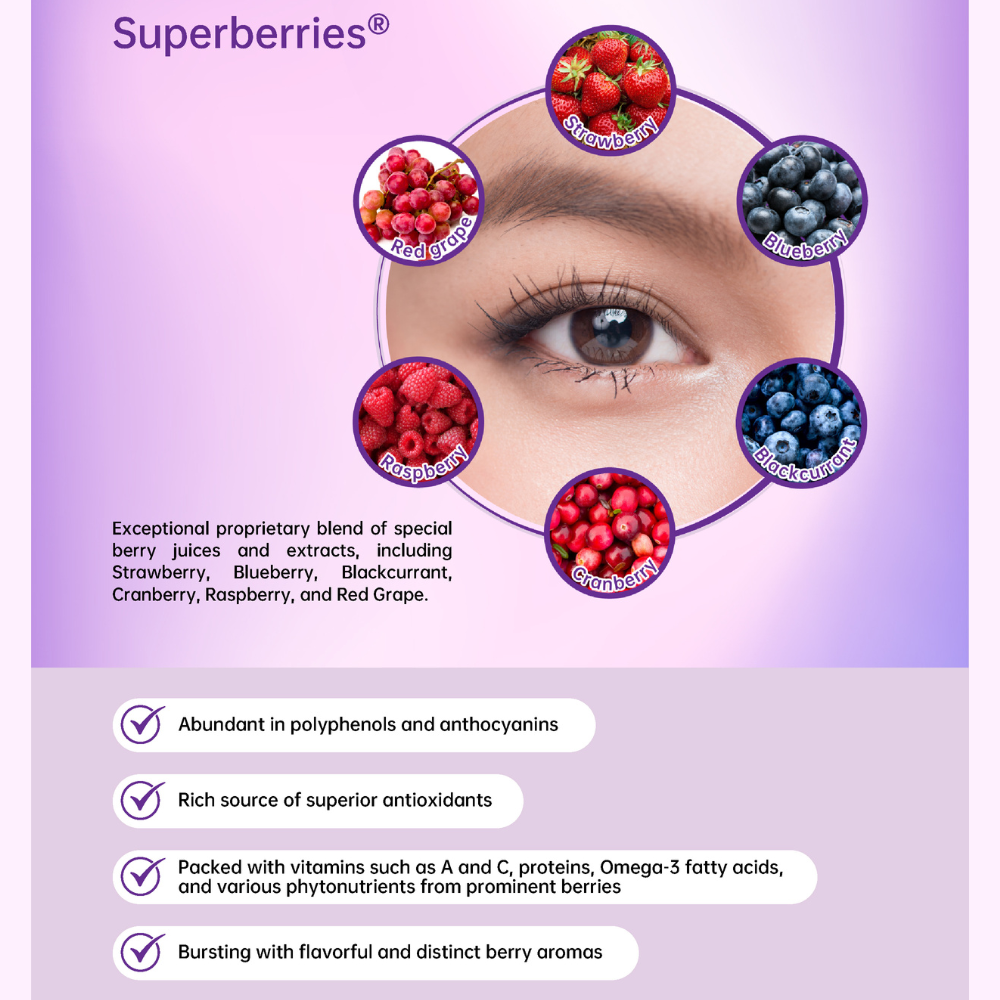 • Contains 7 types of berries - Rich in antioxidants, Vitamin A, C, and Omega, supporting overall eye health and immunity.