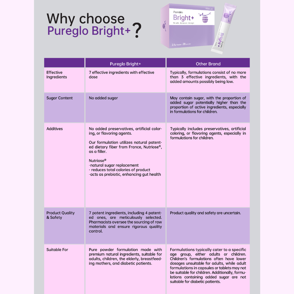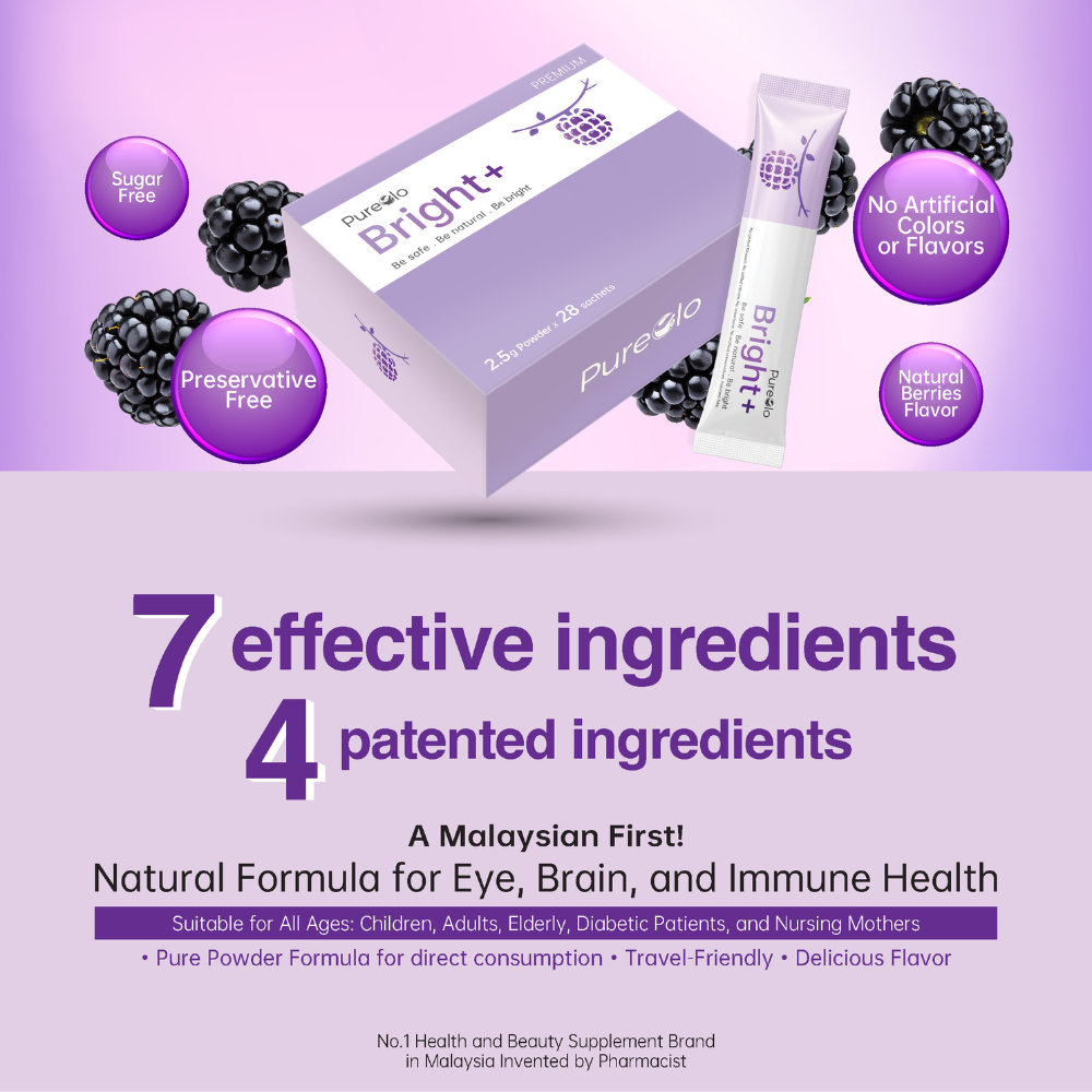 • Pureglo Bright+ is an advanced eye supplement available in Malaysia, featuring seven active ingredients designed to promote overall eye health and well-being.
