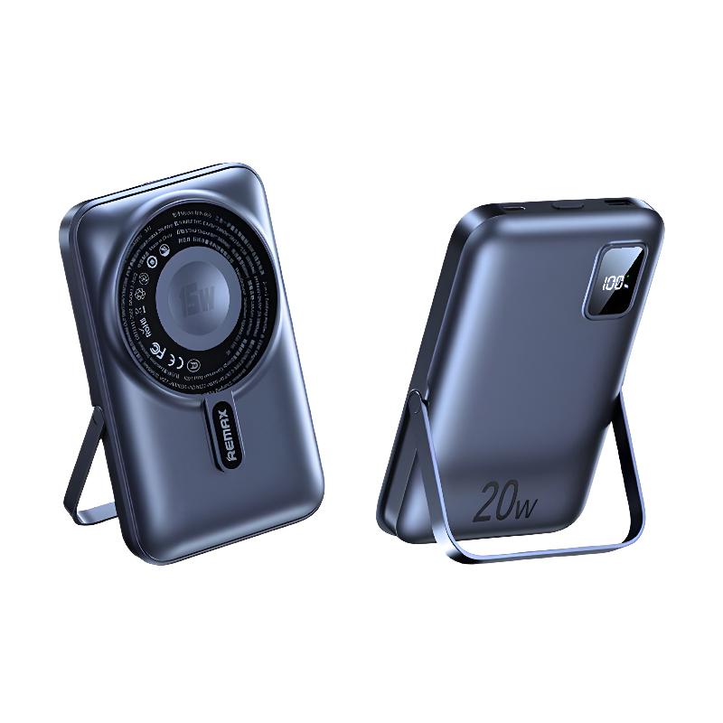Remax RPP-695 Magnetic 3-in-1 10,000mAh Power Bank supports 15W magnetic wireless charging, PD 20W + QC 22.5W fast wired output, and a foldable stand for hands-free use. One compact device for wireless, cable, and fast charging — perfect for daily carry.