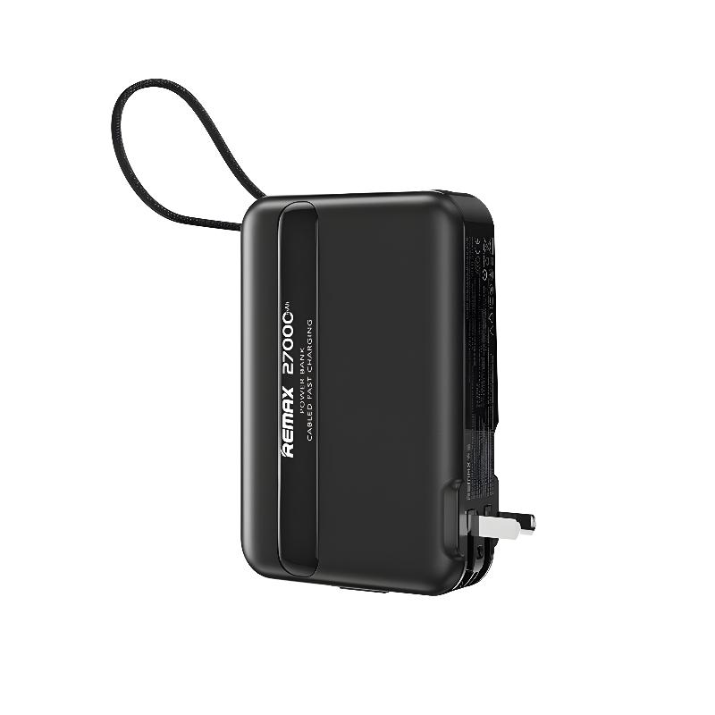 Remax RPP-E7 27,000mAh Power Bank delivers up to 35W dual fast charging with two built-in Type-C cables and a foldable AC wall plug for direct recharging. One powerhouse for long trips, heavy users, and multi-device charging.