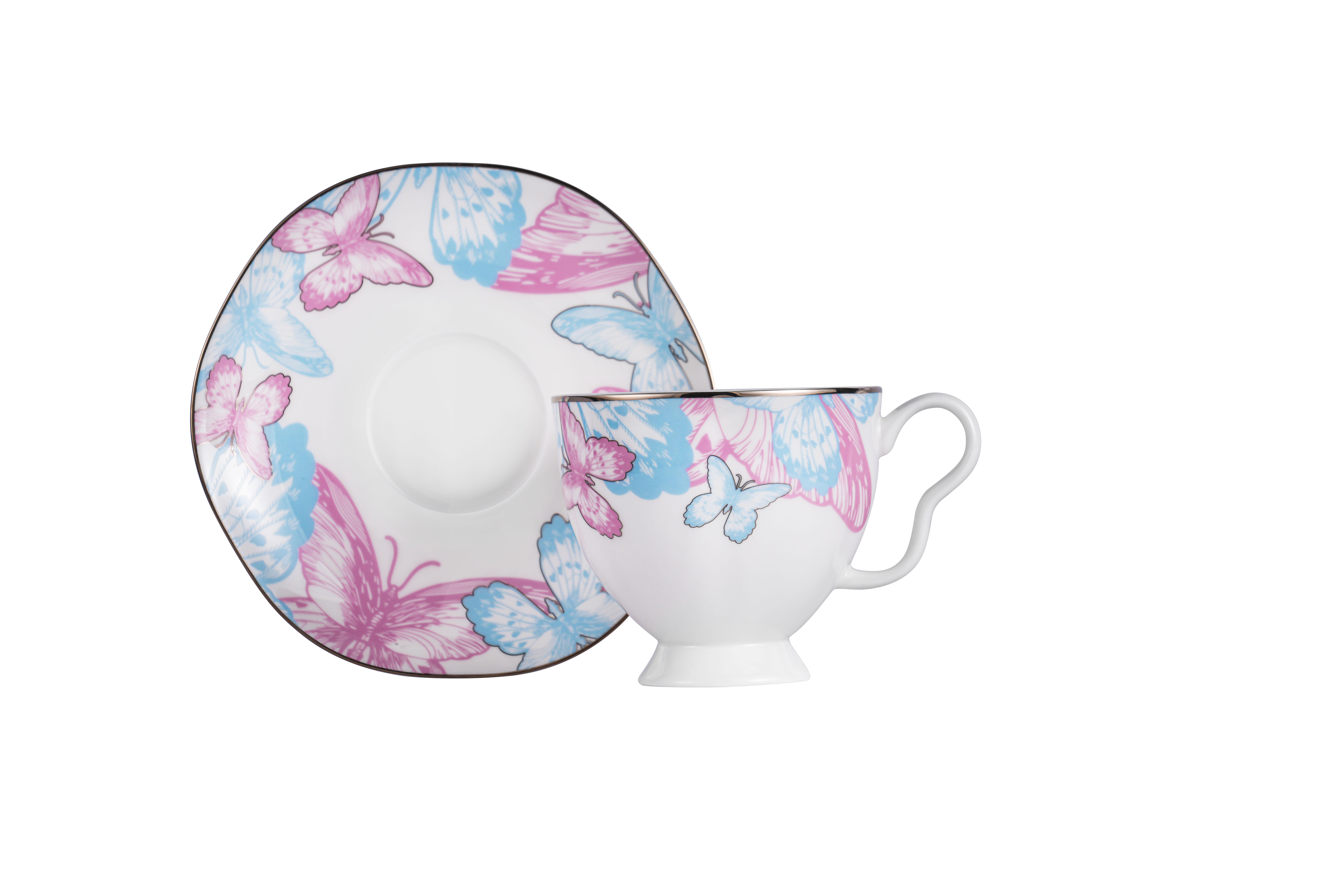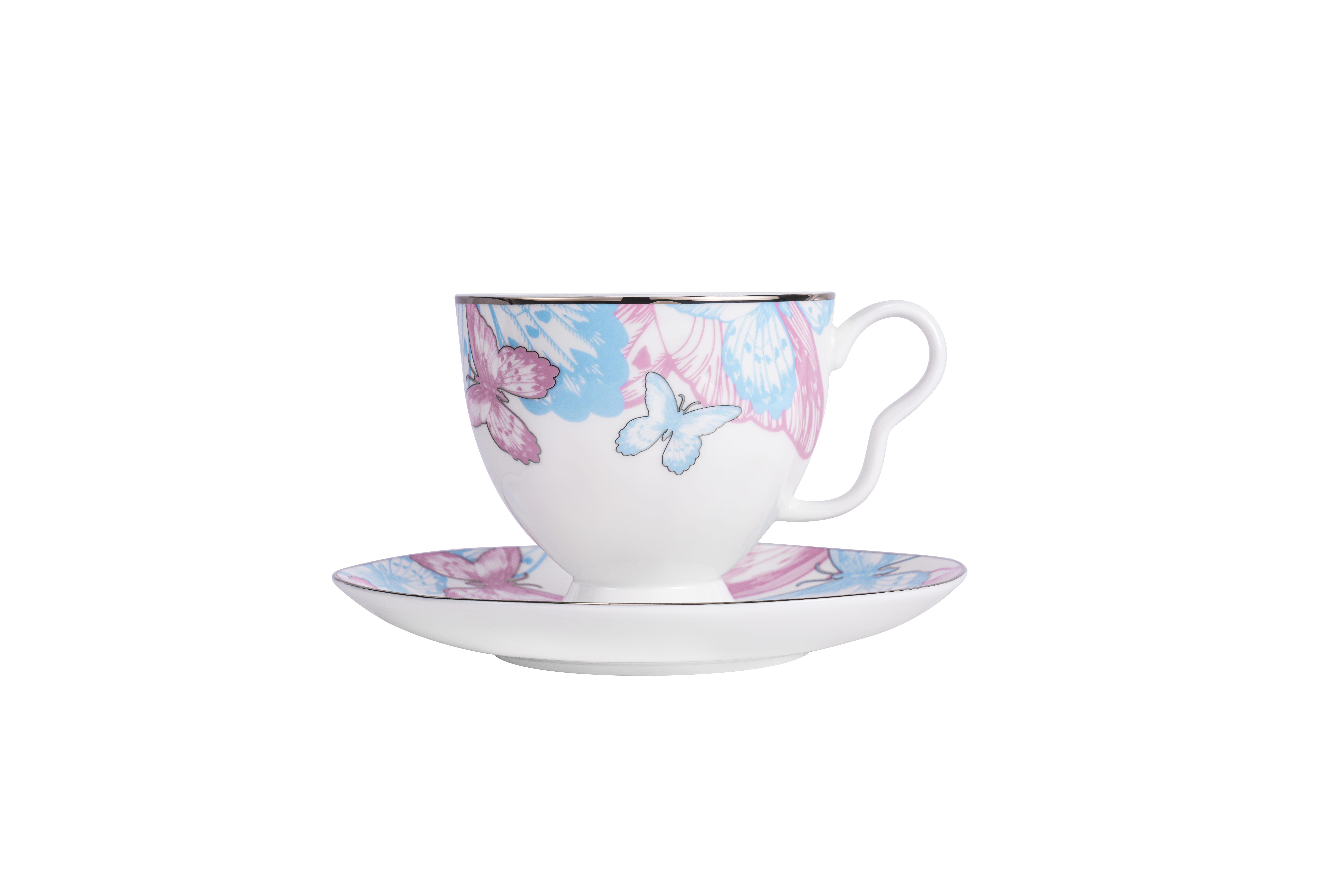 The all-over pattern arranges indigo and blush butterfly silhouettes across bone china - indigo flowing like distant clouds, soft pink blooming like dawn-kissed roses.