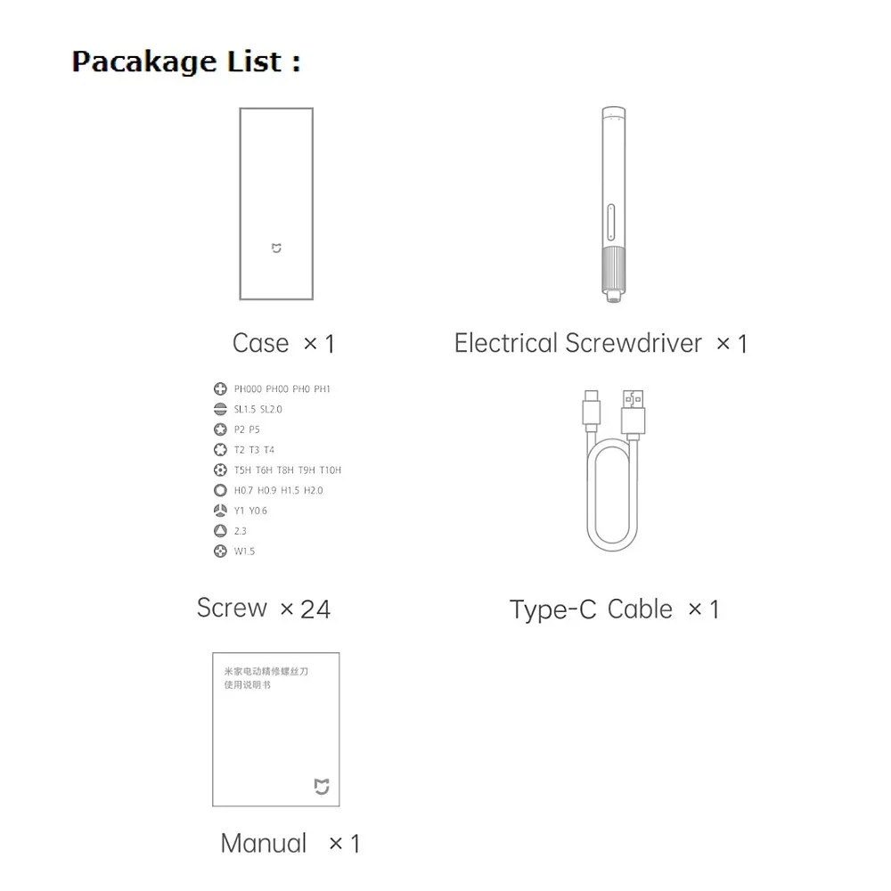 Package Contents:1 x Electric Screwdriver, 24 x Bit, 1 x Type-C Charging Cable, 1 x Storage Box, 1 x Chinese Manual