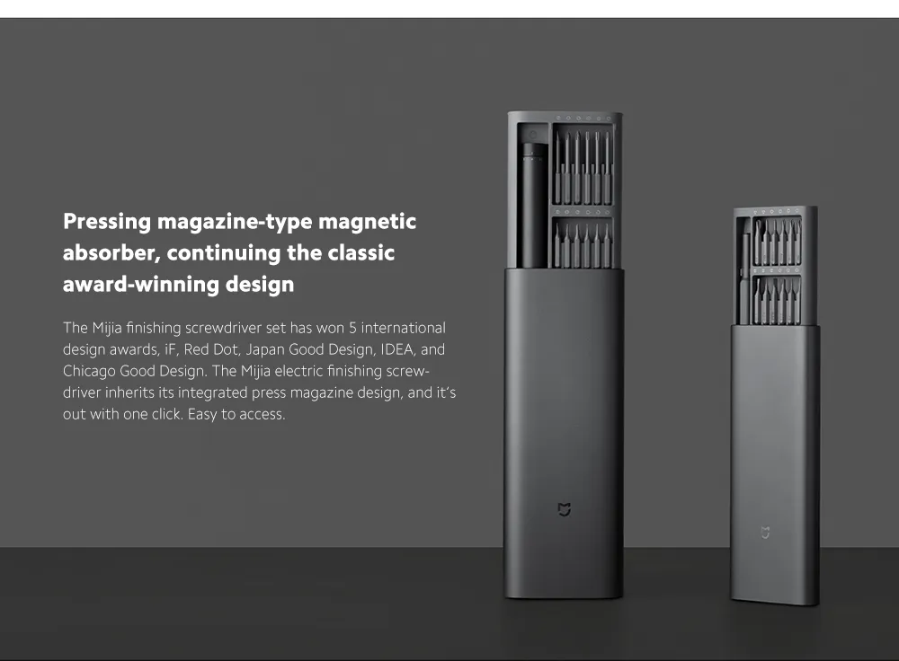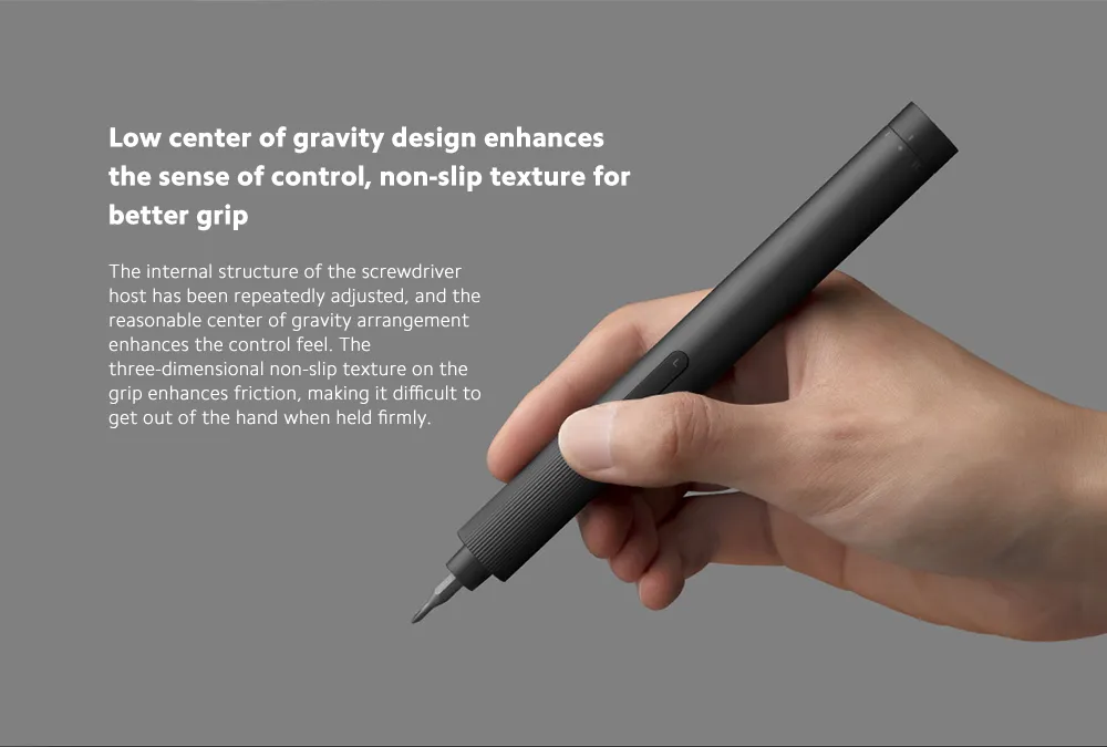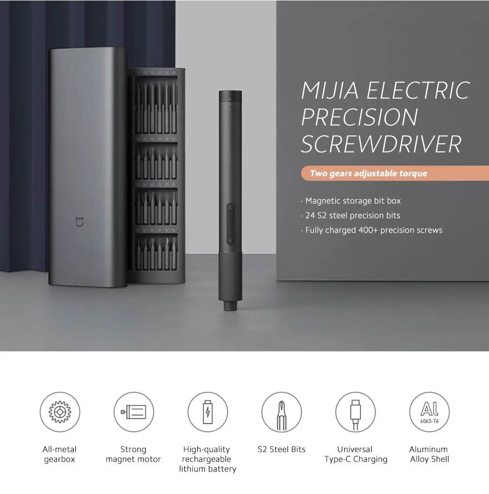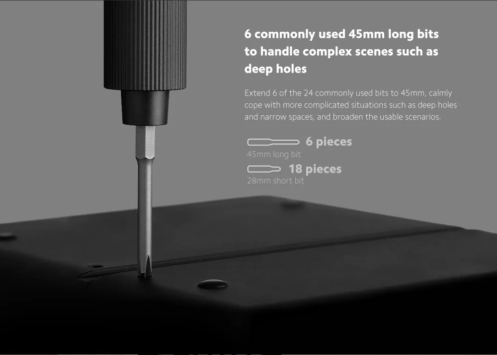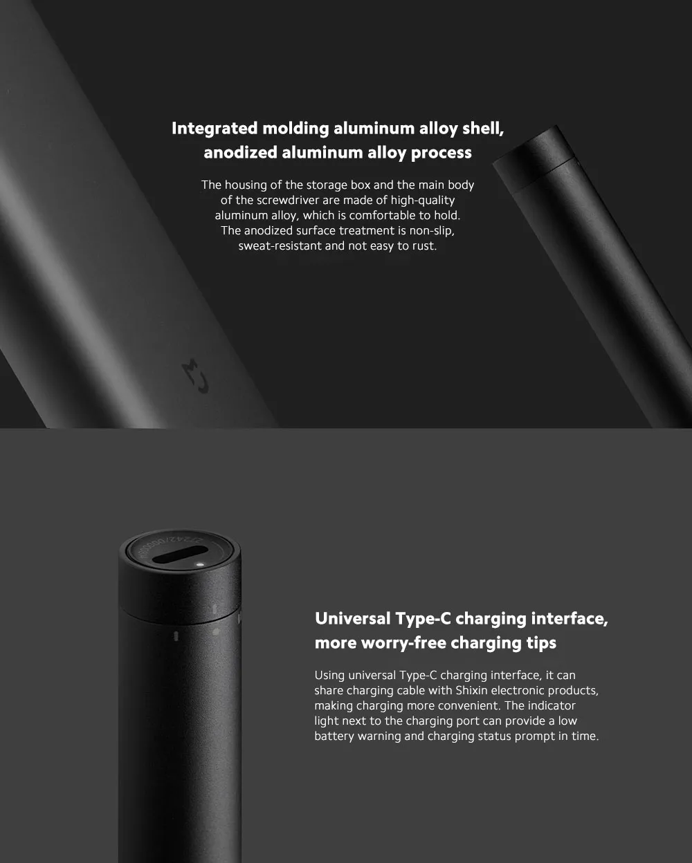 Pressing magazine type magnetic absorption storage, which is easy to use by pressing out.Strong magnetic motor, the maximum speed can reach 200rpm. With the all metal gear box, the concentricity of the bits is less than 0.2mm when rotating, which can effectively improve the finishing efficiency.Small size, built-in rechargeable lithium battery, long service life and 400+ precision screws can be hit when fully charged.9 kinds, 24pcs S2 steel precision bits, hardness up to 60HRC, tough and durablem meets the needs of mainstream electronic products and new small household appliances disassembly and assembly.6pcs commonly used 45mm long bits to cope with more complex situations such as deep hole, narrow space and so on.2 gears precise torque regulation. 0.05N·m can be used for mobile phones, watches, glasses and other precision objects. 0.2N·m can be used in smart speaker, notebook and other electronic products.TPU soft rubber material with soft touch is adopted, which can be pressed and used for a long time without tiring hands.Low center of gravity enhances handling, non slip texture for better gripIntegrated aluminum alloy shell, anodized aluminum alloy process is antiskid, sweat resistant and not easy to rust.Universal type-C charging interface. The indicator light beside the charging port can provide low power warning and charging status prompt in time.13 battery safety tests & 3 charging protection is safer