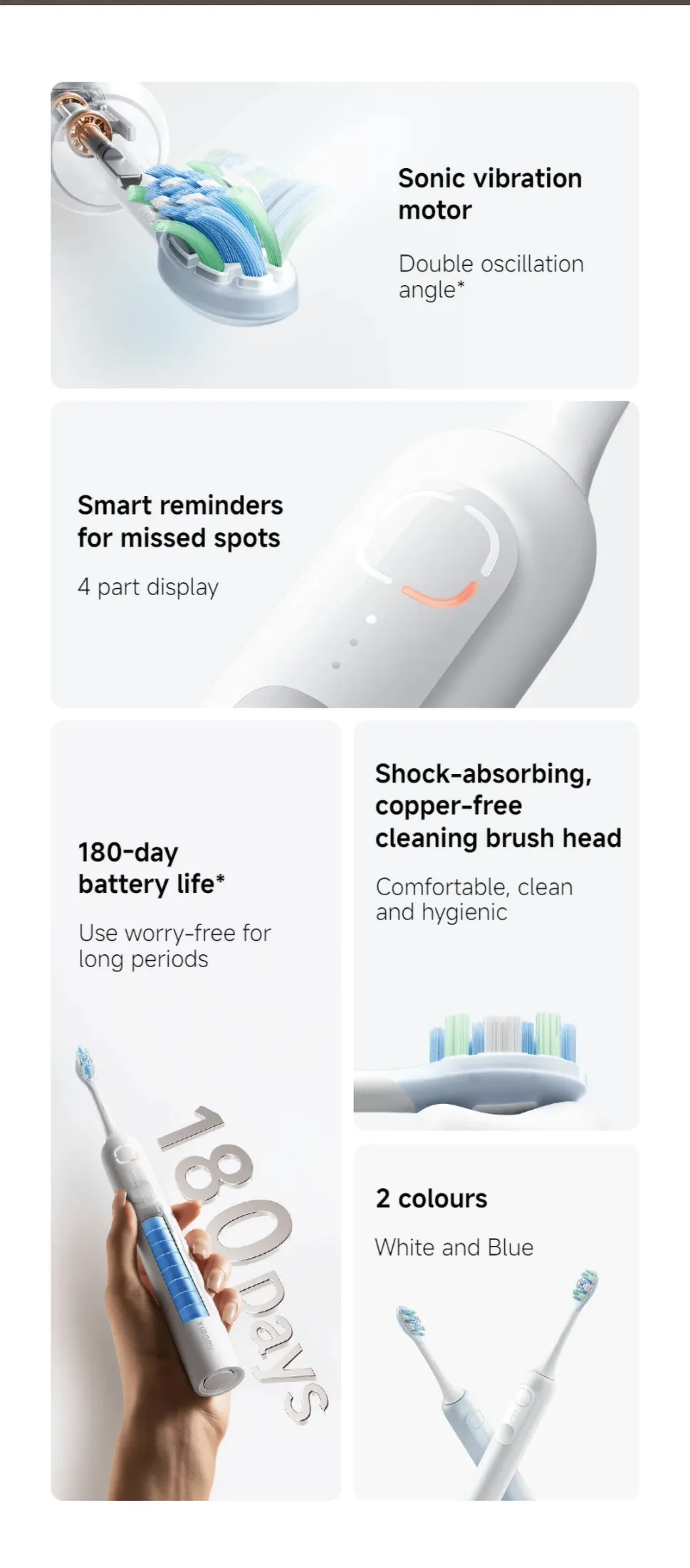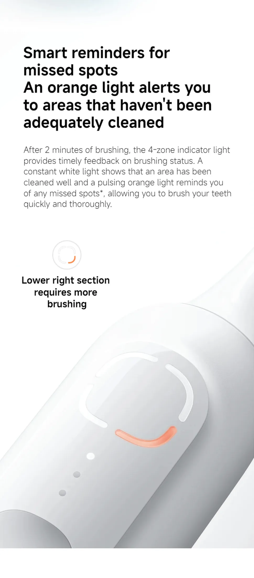 • Smart zone indicator: After 2 minutes of brushing, the four‑zone light shows white for well‑cleaned areas and a flashing orange light to alert you to missed spots.